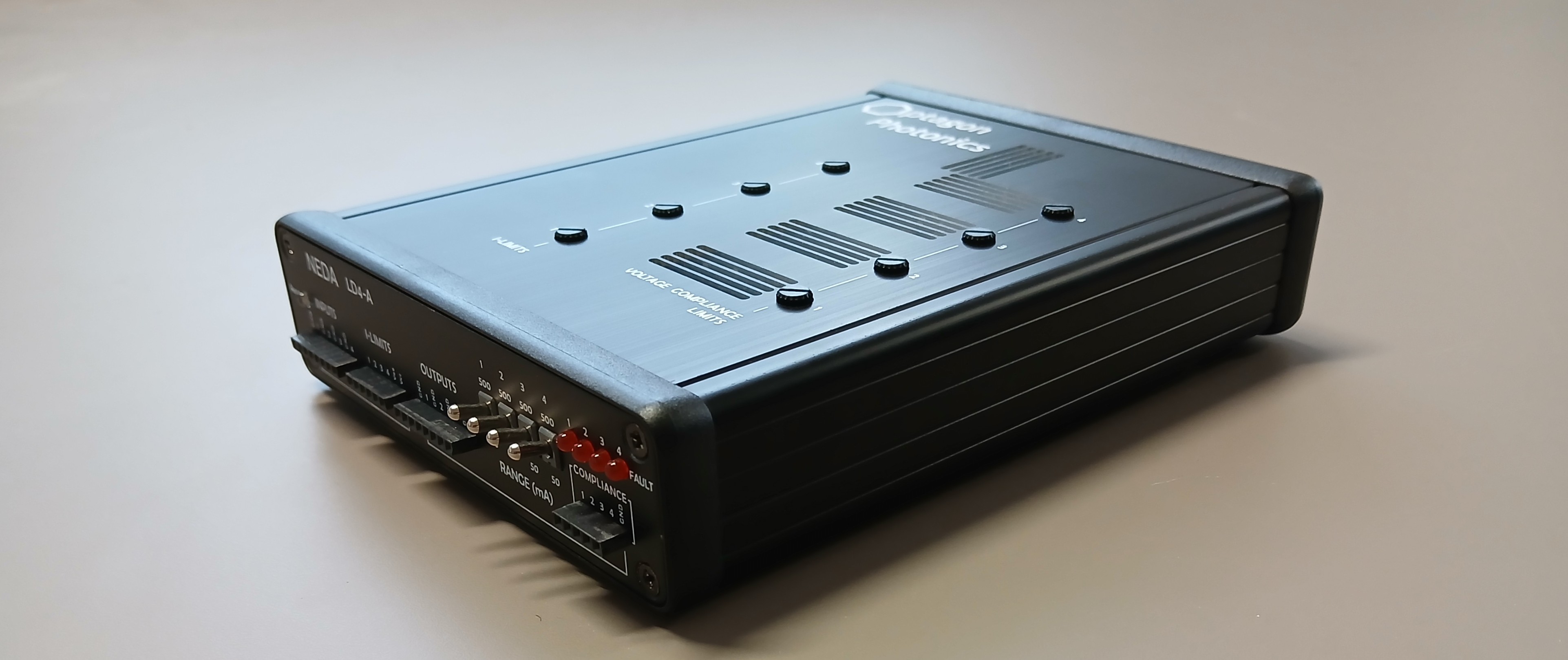NEDA LD4-A is our powerful 4-channel driving engine for active elements such as laser diodes, superluminescent diodes and semiconductor optical amplifiers, and for low resistance heating electrodes. It incorporates by design all safety features required for operation of sensitive optoelectronic loads, and provides up to 4 V compliance voltage and up to 500 mA output current per channel. The channels form a quad of independent voltage controlled current sources based on a common-cathode architecture that makes our engine ideal as a driving solution for active multi-element chips and PICs.